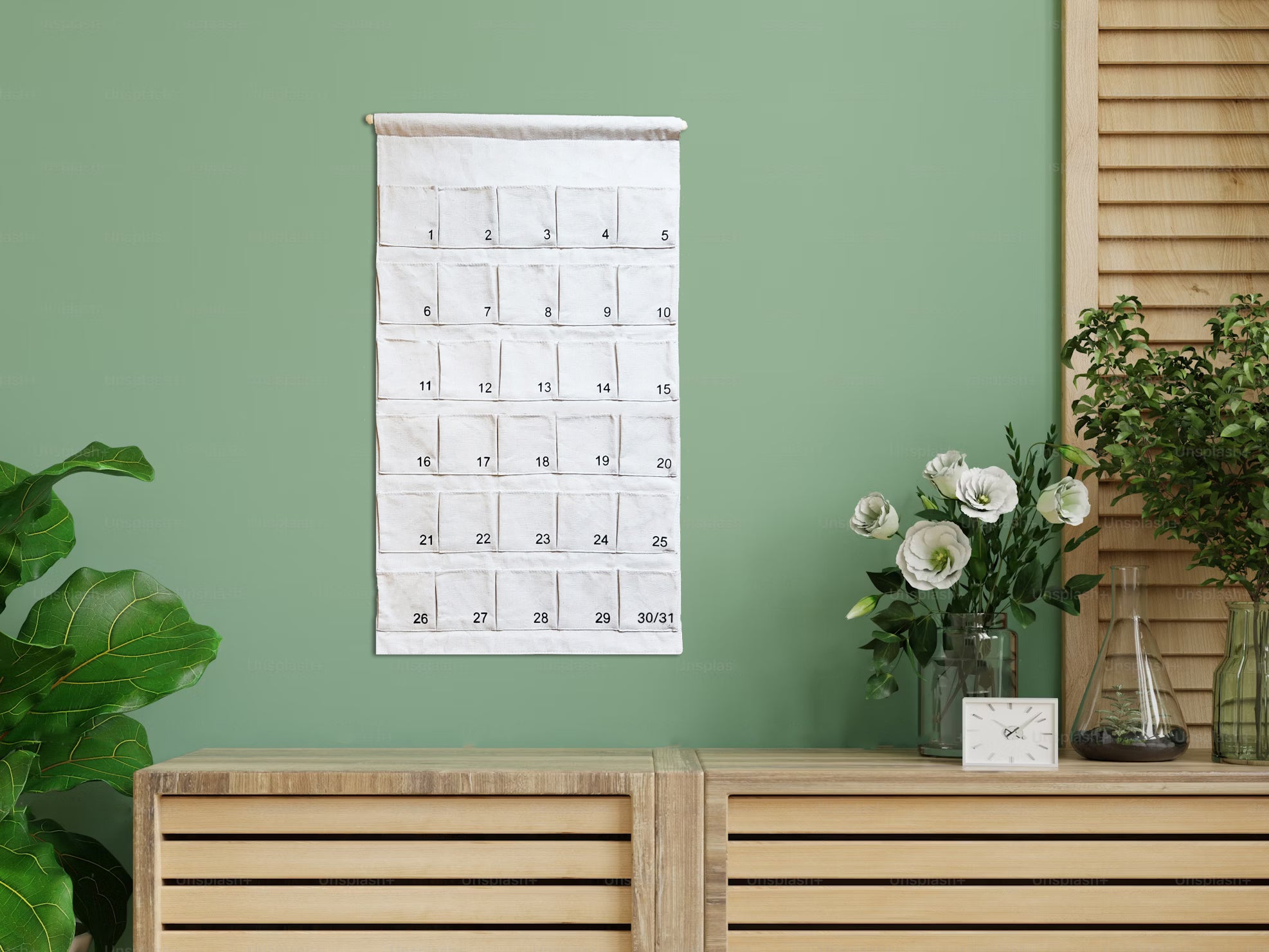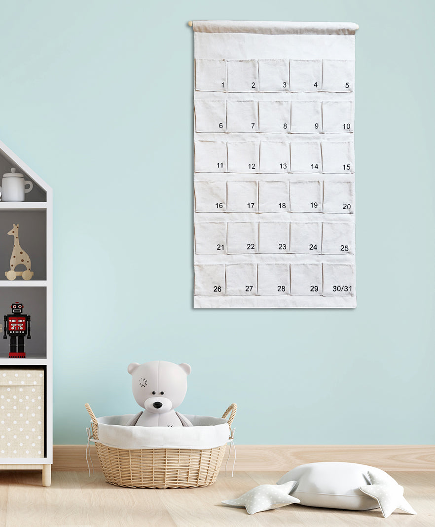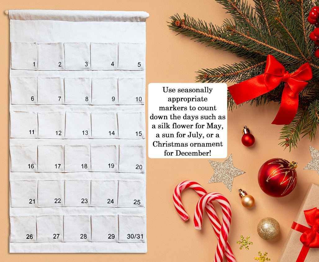 Count down the days to any special event with this 30-day countdown calendar. As you await birthdays, holidays, vacations, visits from family and loved ones, and other special days, use any small marker to help count down the days. Denote the day you are counting down to with a special surprise in the pocket.