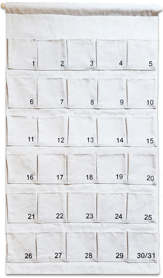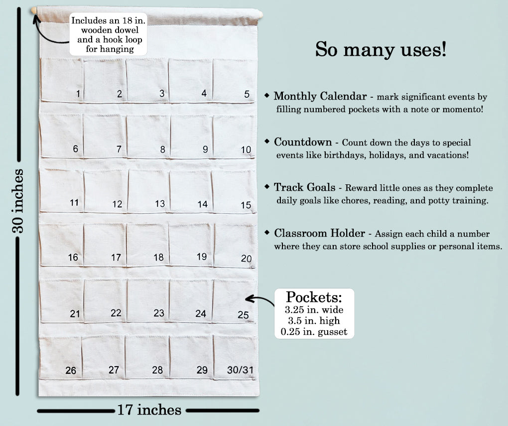 So many uses for this simple yet elegant 30-Day Canvas Pocket Wall Hanging! Compliment any room of your home with this sturdy quality-crafted canvas hanging. Each pocket measures 3.25" wide by 3.5" high, with a .25" gusset. Below are some fun suggestions for use: