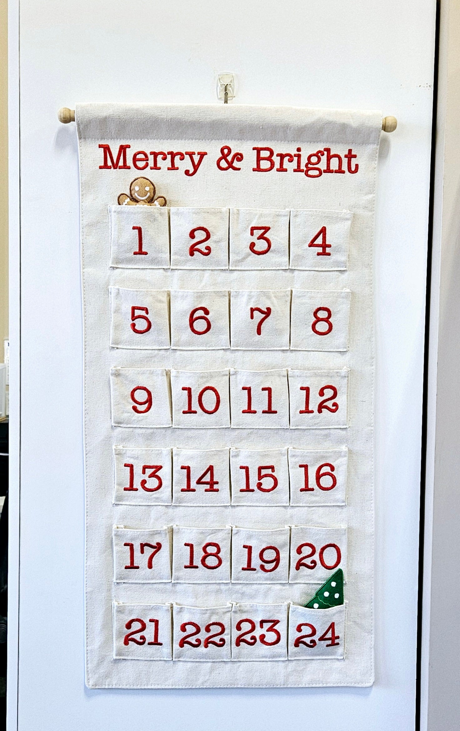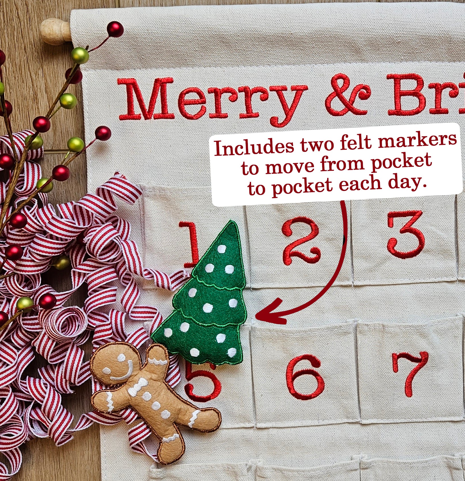 Start a family tradition! This canvas Christmas advent countdown with 24 pockets and two felt markers is sure to become a festive, holiday favorite. This newly-designed classic cream canvas Christmas countdown calendar with beautifully embroidered details will thrill kids of all ages as the felt Gingerbread Man and felt Christmas Tree are moved from pocket to pocket each day.