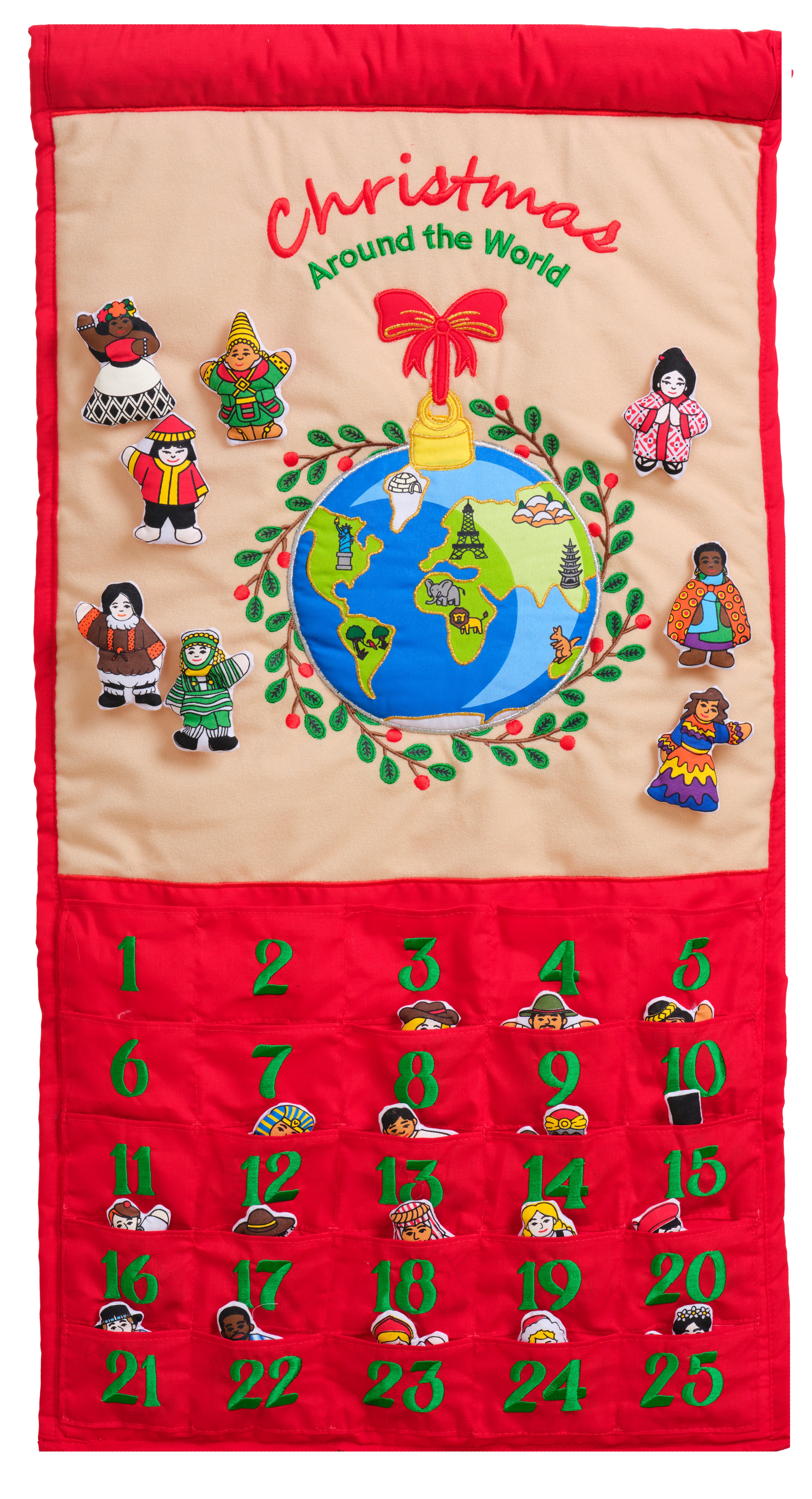 "Christmas Around the World" advent calendar celebrates diverse cultures of our world and the unity we share. Each pocket of this beautifully detailed handmade advent calendar holds an ornament representing people and cultures from around the world.