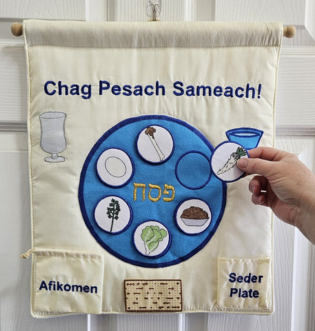 Start a new family tradition with the perfect Passover gift! Kids of all ages will be delighted with this interactive, sturdy and reuseable Jewish Passover fabric wall hanging. It's the perfect teaching and learning tool for little ones to embrace tradition and symbolism! Celebrate the traditional Seder meal by placing each traditional food on the plate as the story of Exodus is retold. Food will "stick" to the plate by a hook & loop fastener on the back. As an added bonus, the name of each food is printed on the back of the circle. Learning is reinforced by the tactile and interactive nature of the wall hanging as children eagerly engage in the process.